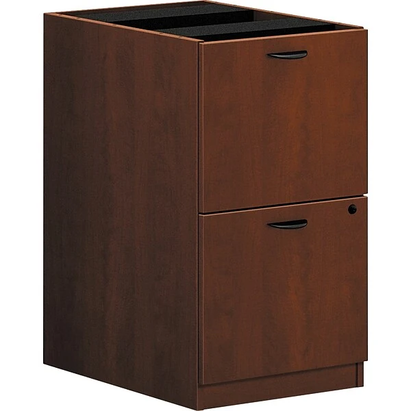 Attach this file cabinet to your desk or table top to create extra storage without reducing your available floor space. The two roomy file drawers hold legal- or letter-size hanging file folders for convenient access right where you work, while the medium cherry wood finish matches compatible HON work surfaces, giving your office space a cohesive look. The file cabinet remains beautiful for years thanks to its thick stain and dent-resistant top coat.