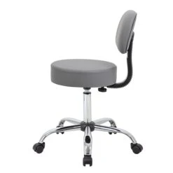 This medical stool is upholstered in durable Grey, easy to clean antimicrobial vinyl, and equipped with a 4-inch thick molded foam seat that provides improved comfort and durability. It has an easy to reach gas lift seat height adjustment lever, providing a 6 inch vertical range to suit your comfort and work environment. Its base has an attractive chrome finish and provides great stability. Hooded double wheel casters make it easy to move and shift directions. This stool has a back cushion that provides comfortable back support through extended periods of work. It also has an adjustable back depth for additional comfort.