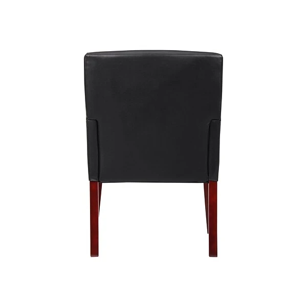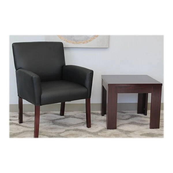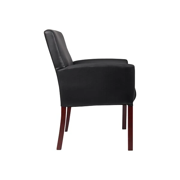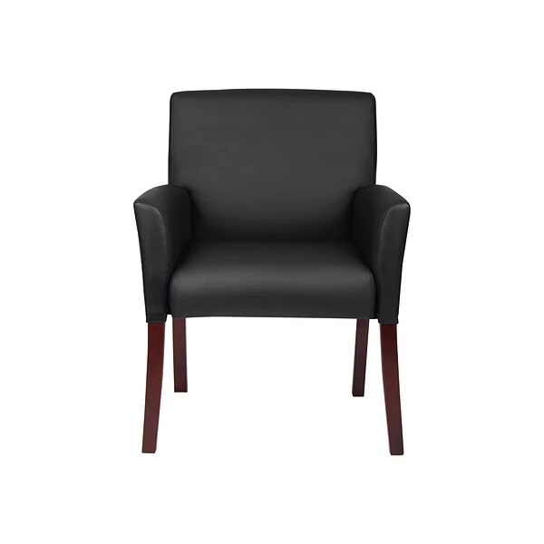 Enhance the aesthetic of waiting rooms, lounges and other areas with this guest chair. The wood frame and legs are made with a mahogany finish, offering a rich, cozy appearance, while the black upholstery provides a sleek, professional look. Enjoy the structured design thanks to this chair’s fixed arm rests. Made with durable Caressoft upholstery, this chair stands up to daily use and offers a soft cushion for added comfort. This BOSS box-arm guest chair can easily accommodate a weight of up to 275 pounds and has a sturdy back, offering enhanced support when sitting for long periods of time.