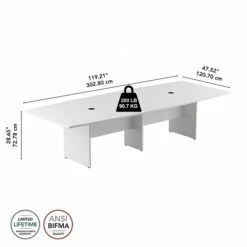 Bring your team together in a private or open-plan office with the Bush Furniture boat-shaped conference table. Perfect for medium to large-sized groups, this meeting table provides ample room for 8 to 10 users to collaborate with laptops, paperwork, and other materials. A durable thermally fused laminate surface with continuous edge banding protects against everyday damage while a finished underside prevents snagged clothing. The tabletop also has two wire management grommets to accommodate a projector or speakerphone. The conference room table is supported by a sturdy wooden base for a weight capacity of 200 lbs., making it great for use in a variety of professional and educational settings. This long office table is tested to meet ANSI/BIFMA standards for safety and performance and is backed by a lifetime manufacturer limited warranty. American-made with US and imported parts.
