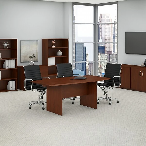 Bring your team together in an open or private office space with the Bush Business Furniture 72W x 36D Boat Shaped Conference Table. The spacious design comfortably seats 4-6 in a variety of environments from board rooms to executive offices or any collaborative setting. A finished underside prevents snagged clothing, while a wood base provides durability and includes adjustable levelers for a stable design on any floor. With wire management grommets, the long Conference Table keeps unsightly cables contained. Continuous edge banding protects against nicks and dings, and the thermally fused laminate finish resists stains and scratches throughout years of everyday meetings. The commercial-grade Boat Shaped Conference Table meets ANSI/BIFMA quality test standards and comes with a Bush Business Furniture Limited Lifetime Warranty. American made with U.S. and imported parts.