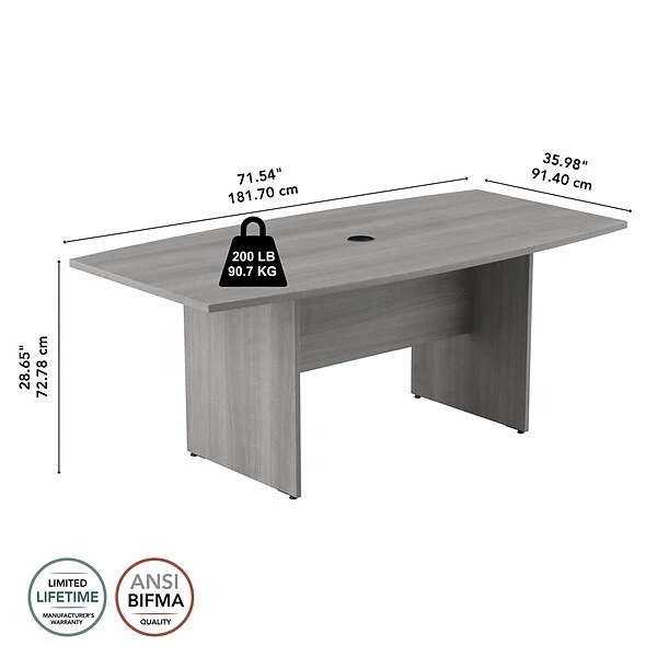 Bring your team together in a private or open-plan office with the Bush Furniture boat-shaped conference table. Perfect for small to medium groups, this meeting table provides ample room for four to six users to collaborate with laptops, paperwork, and other materials. A durable thermally fused laminate surface with continuous edge banding protects against everyday damage while a finished underside prevents snagged clothing. The tabletop also includes a wire management grommet to accommodate a projector or a speakerphone. The conference room table is supported by a sturdy wooden base for a weight capacity of 200 lbs., making it great for use in a variety of professional and educational settings. This long office table is tested to meet ANSI/BIFMA standards for safety and performance and is backed by a lifetime manufacturer limited warranty. American-made with US and imported parts.
