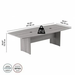 Bring your team together in a private or open-plan office with the Bush Furniture boat-shaped conference table. Perfect for medium- to large-sized groups, this meeting table provides ample room for six to eight users to collaborate with laptops, paperwork, and other materials. A durable thermally fused laminate surface with continuous edge banding protects against everyday damage while a finished underside prevents snagged clothing. The tabletop also has two wire management grommets to accommodate a projector or speakerphone. The conference room table is supported by a sturdy wooden base for a weight capacity of 200 lbs., making it great for use in a variety of professional and educational settings. This long office table is tested to meet ANSI/BIFMA standards for safety and performance and is backed by a lifetime manufacturer limited warranty. American-made with US and imported parts.