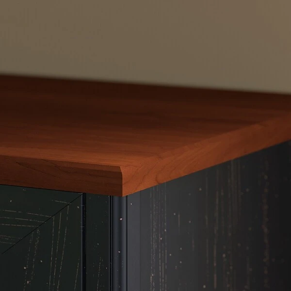 Blend style and functionality in your home office with the Bush Furniture Fairview 2 Drawer Lateral File Cabinet in Antique Black. The charming Hansen Cherry top surface and beautiful Antique Pewter hardware accents blend perfectly with existing decor. Height matches the Fairview Computer Desk (sold separately) for an extended work surface when positioned side-by-side. Full-extension file drawers glide on smooth ball bearing slides for easy access to letter, legal or A4-size files. An interlocking drawer mechanism prevents tipping for added safety. Fairview meets ANSI/SOHO quality test standards for performance and safety and comes with a Bush Furniture 6 Year Manufacturer’s Warranty. With casual styling and traditional detail, Fairview offers an alluring appearance without sacrificing functionality. See the full collection for coordinating home and office items available.