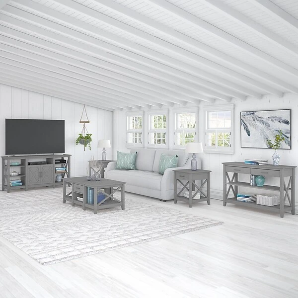Featuring a relaxed modern farmhouse style, the Bush Furniture Key West console table with drawers and shelves is a perfect choice for your casual home. The Bush Furniture Key West console table with drawers and shelves is a perfect way to bring the feel of a coastal retreat to any living space. X-shaped accents and your choice of casual finish present a look that works well in homes that embrace farmhouse styling. Box drawers organize household supplies while two shelves offer plenty of room for books, decorations, and more. The bottom shelf is fixed for stability, and the upper shelf can be adjusted to accommodate items of various sizes. The surface is ideal for displaying personal touches like plants, pictures, and other decor. Use the sofa table on its own, or combine it with coordinating Key West products for a complete living room furniture set. This console table with storage has been tested to meet Bush Furniture’s standards for safety, performance, and durability and is backed by a 1-year warranty.