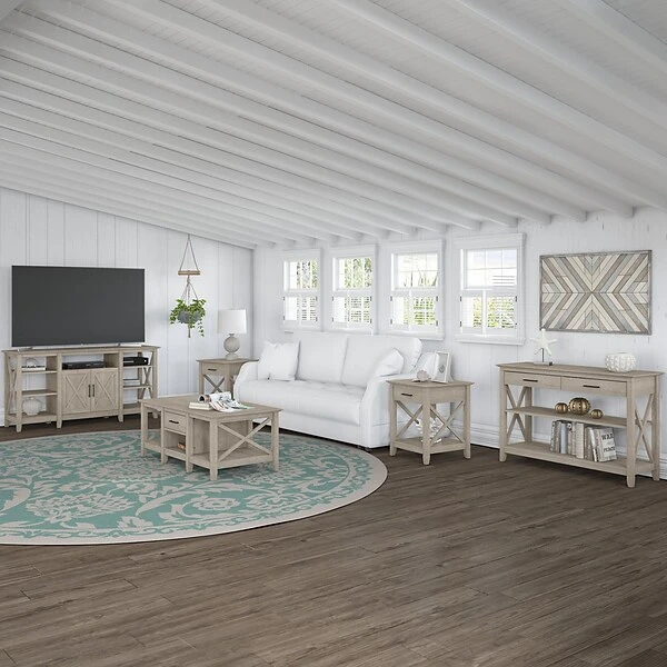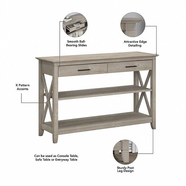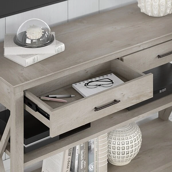 Featuring a relaxed modern farmhouse style, the Bush Furniture Key West console table with drawers and shelves is a perfect choice for your casual home. This table is a perfect way to bring the feel of a coastal retreat to any living space. Unique X pattern accents and a slightly weathered finish present a look that works well in homes that embrace farmhouse styling. Box drawers organize household supplies while two shelves offer plenty of room for books, decorations, and more. The bottom shelf is fixed for stability, and the upper shelf can be adjusted to accommodate items of various sizes. The surface is perfect for displaying personal touches like plants, pictures, and other decors. Use the 30″H x 47″W x 16″D sofa table on its own or combine it with coordinating Key West products for a complete living room furniture set. This console table with storage has been rigorously tested to meet Bush Furniture standards for safety, performance, and durability and is backed by a 1-year warranty.