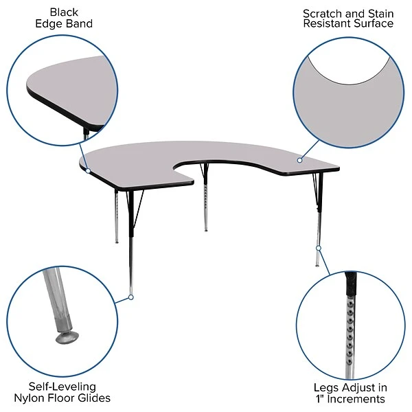 Flash Furniture Horseshoe activity table features 1 1/8″ thick thermal fused grey lamination top. Table features standard height adjustable 16 gauge tubular steel legs and scratch/stain resistant surface.