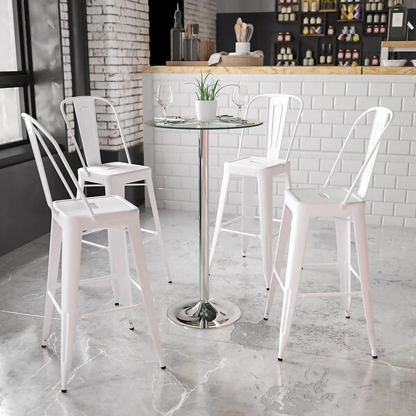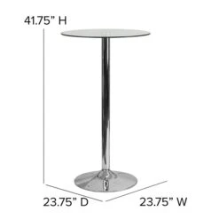 Create the perfect socializing and dining experience with this bar height table. The table has a narrow design so that there is plenty of room for larger tables to be setup. The round, chrome base is out of the way when guests are socializing and adds a contemporary chic design. The base is fitted with a protective plastic ring, made to prevent your floor from being scratched. This table can be used as a standalone option or with the use of similarly designed adjustable height barstools with chrome base.