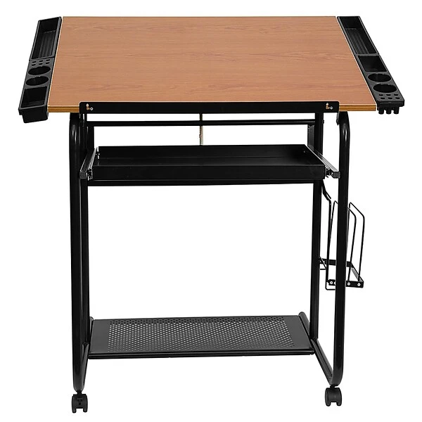 Raise or lower the angled work surface of the Flash Furniture adjustable drafting or drawing table to meet the needs of your body and your work. Keep designs at a high angle to reduce hunching for less pain in the shoulders, neck, and back after lengthy work sessions. Select a smaller angle to create stability when working on highly detailed drawings. Storage Options