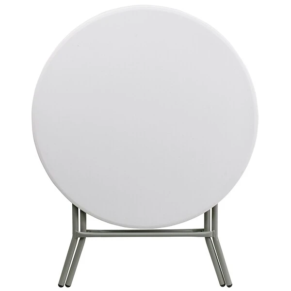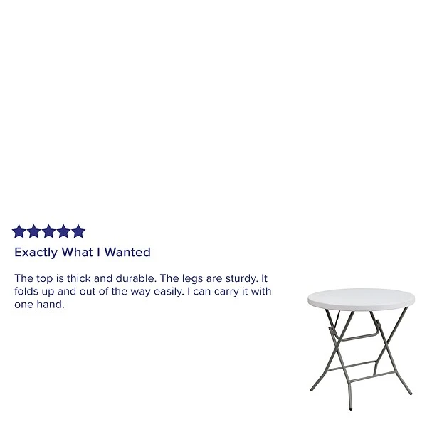 Use this small folding table in banquet halls, in cafeterias or in the home. This table is a great solution for temporary setups for displaying food or other small items. The durable, blow-molded top is low-maintenance and cleans easily. It’s easy to fo ld the legs flat under the table top to make storage more convenient and for better portability. This table is commercial grade to withstand everyday use in the hospitality industry.