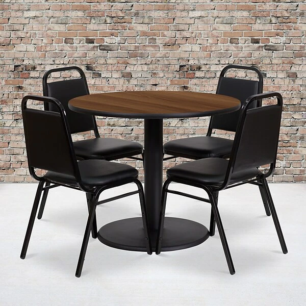 Don’t have time to search through hundreds or thousands of table and seating options? This complete Banquet Table and Chair set saves you time to focus on your growing business. This set includes an elegant Walnut Laminate Table Top, Round Base and 4 Black Banquet Chairs that have a 500 lb. capacity rating to accommodate all users. Surface is heat, scratch and moisture resistant. Easily clean using a mild detergent and water, dry clean to keep your tables spotless. Use this setup in banquet halls, wedding ceremonies, hotel conferences, restaurants, break room/cafeteria settings or any other social gathering. Whether you are just starting your business or upgrading your home or business furniture this restaurant quality table set will round out your dining space.