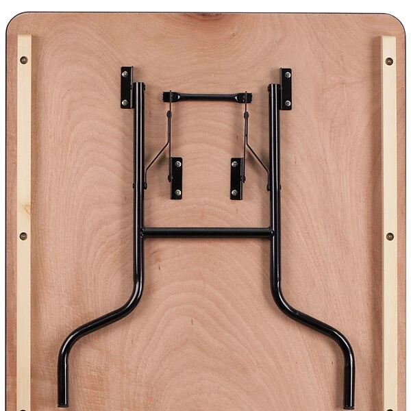 This rectangular wood folding table is beneficial in a multitude of settings that include banquet halls, banquet facilities, cafeterias, schools and in the home. The table can be used as a temporary seating solution or be setup for everyday use. This table features a .75” thick plywood top with black edge band. This folding table is certain to withstand the test of time. Two extra-wide bolted wood runners are fastened to the underside and designed to allow for safe table stacking. The runners are secured to the table tops with flush fitting, flat head bolts and locking nuts. The heavy duty locking wishbone legs are constructed of 1”, 18 gauge tubular steel and commercial grade powder coating.