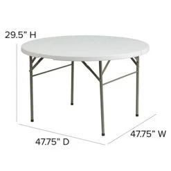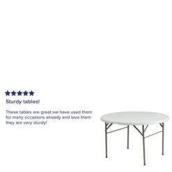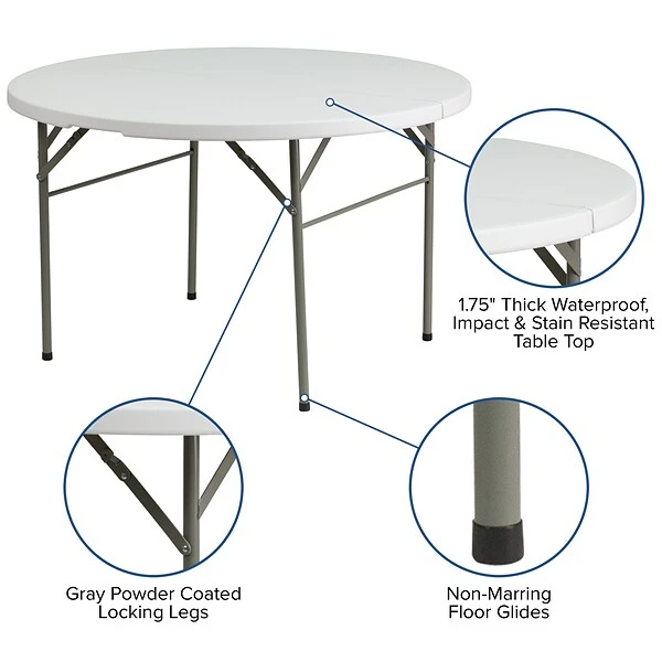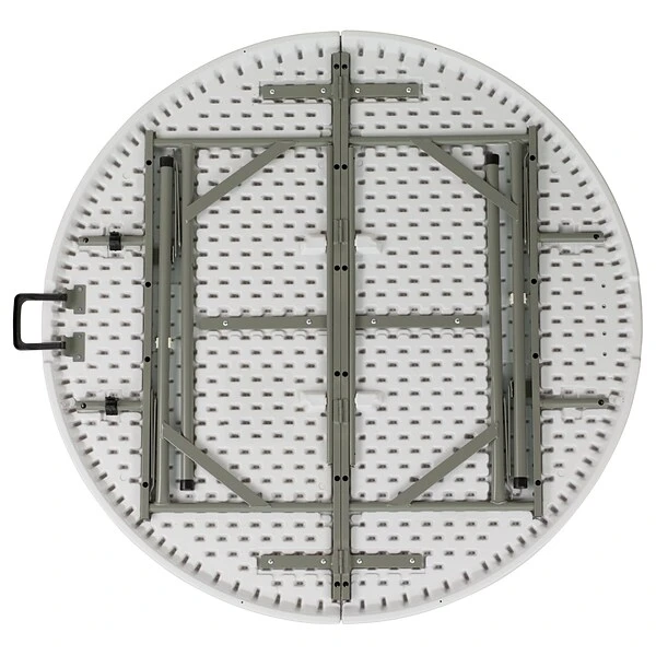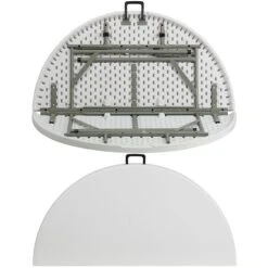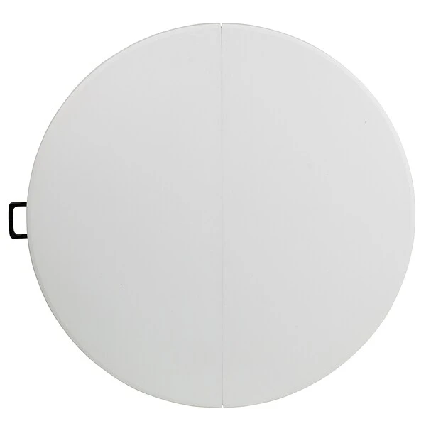 This round folding table is 4 feet long and is beneficial in a multitude of settings that include banquet halls, conference centers, cafeterias, schools and in the home. The table can be used as a temporary seating solution or be setup for everyday use. The bi-fold feature folds the table in half the size and includes a carrying handle for easy transport. The durable blow molded top is low maintenance and cleans easily. The table legs fold under the table to make storage more convenient and for better portability. This table is commercial grade to withstand everyday use in the hospitality industry.
