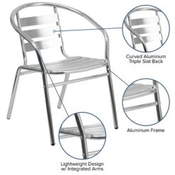 Enhance your bistro, cafe, restaurant, hotel or home patio space with this aluminum chair. This chair features a curved, slat style back to keep you comfortable. This chair is constructed of lightweight aluminum to easily move and stack for storing. Cro ss braces provide extra stability. The protective plastic feet prevent damage to flooring. The frame is designed for all-weather use making it a great option for indoor and outdoor settings. For longevity, care should be taken to protect from long perio ds of wet weather. Pair this chair with an aluminum table to complete your setting.