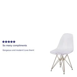 This easily recognizable designed chair will make a great accent or dining chair. The smooth contours of the chair conform to your body allowing you to sit comfortably. The durable matte plastic molded chair and geometric gold metal base provides an artistic appeal.