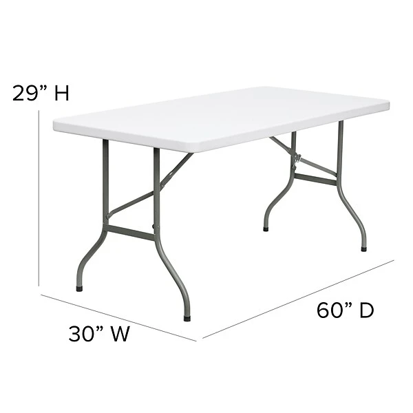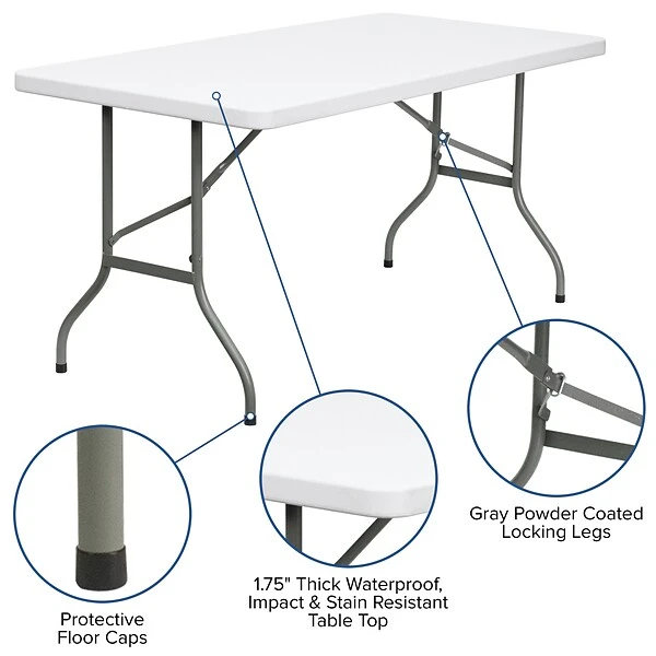 Create a group space with this folding table. Its commercial-grade construction and waterproof plastic top ensure indoor and outdoor functionality, and the resistance to impacts and stains prevents damage from heavy use. The 330-pound static load capacity of this Flash Furniture 5-foot folding table provides confidence and stability when creating heavy displays or leaning on the surface during meals or activities.