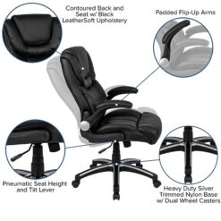 Having the right chair to support you through your work day is priceless. This high back executive office chair with a double layered headrest provides a savvy appearance with soft and durable LeatherSoft upholstery. High back office chairs extend to the upper back for greater support and relieve tension in the lower back, preventing long term strain. Built-in lumbar support paired with the contoured back and seat will cradle you in comfort. The tilt lock mechanism rocks/tilts the chair and locks in an upright position while the tilt tension adjustment knob adjusts the chair’s backward tilt resistance. Chair easily swivels 360 degrees to get the maximum use of your workspace without strain. The pneumatic adjustment lever will allow you to easily adjust the seat to your desired height. Give yourself the gift of comfort that will help you stay focused to power through your working hours.