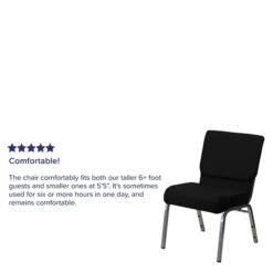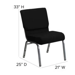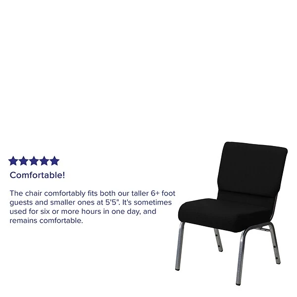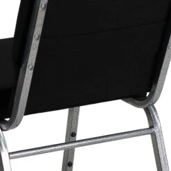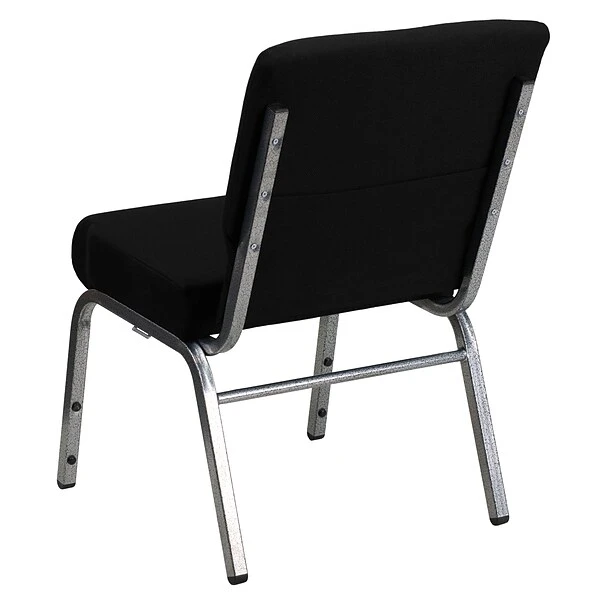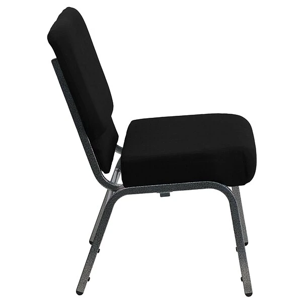 Flash Furniture HERCULES™ 21” extra wide Stacking church chair is black fabric upholstery made with 3.75” thick seat and silver vein frame finish. Chair with ganging clamps has waterfall seat that reduces leg strain.