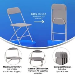 Offering contoured comfort, and innovative design, this set of 4 big & tall, extra wide commercial grade plastic folding chairs is a must have for any occasion. The extra width and taller height of this all-weather folding chair is ideal for those with mobility issues, or prefer more spacious seating. Featuring dry-assist textured seats, these foldable chairs provide the highest level of comfort and security for any indoor or outdoor event.