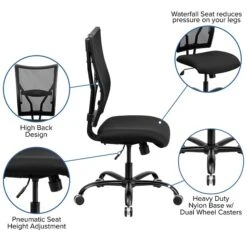 Finding a comfortable chair is essential when sitting for long periods at a time. This Big & Tall office chair offers a broader seat and back width designed to accommodate larger and taller body types and has been tested to hold a capacity of up to 400 lbs. High back office chairs extend to the upper back for greater support and relieve tension in the lower back, preventing long term strain. Mesh office chairs can keep you more productive throughout your work day with a ventilated back design that allows air to circulate to keep you cool. The waterfall front seat edge and extra large, height adjustable chrome foot ring remove pressure from the lower legs and promote better posture. A synchro tilt control allows the chair’s back and seat to recline at different rates. Chair easily swivels 360 degrees to get the maximum use of your workspace without strain.