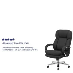 This Big & Tall Executive Office Chair is an ideal chair for larger and taller professionals who spend long hours behind a desk. An extended upper back with integrated headrest and built-in lumbar support reinforces healthy posture. The 22″ wide swivel seat is padded with 4″ of foam. Fine-tune the seat height using the pneumatic height adjustment lever. Generously padded loop arms reduce pressure on the shoulders and neck providing additional comfort. Turn the tilt tension adjustment knob to increase or decrease the amount of force needed to rock and lock the seat in place with the tilt lock mechanism. This sturdy chair has a heavy duty chrome base, smooth rolling dual wheel casters and a 500 pound weight capacity. Whether you’re buying chairs for a 911 dispatch office, call center, or control room, this 24/7 intensive use office chair is the right chair for the job.