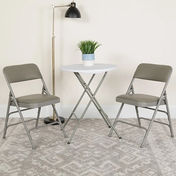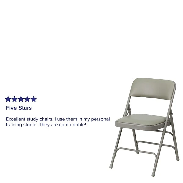 Host Thanksgiving at your house and leave out “bring your own chair” on the invite. Flash Furniture has got you covered with this two-pack of padded folding chairs. Each of these heavy-duty steel folding chairs is built for commercial businesses who host a myriad of events and need to accommodate people of varying sizes. Portable chair is perfect in community centers to transport from storage to venue floor. Change the scenery with this outdoor metal chair by taking the party outside. Take care of your chair, so it lasts you many years by storing indoors. Its 18-gauge curved steel frame is triple-braced with leg strengthening support bars to hold up to 300 lbs. while the nonmarring floor glides protect your flooring from scuffs and scrapes. Celebrate all family events at your home for guests to sit comfortably atop these upholstered folding chairs. The chairs come assembled to be of service as soon as they’re delivered.