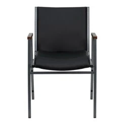 - 18-gauge steel frame with silver vein powder-coated finish, black vinyl upholstery, and cherry capped arms