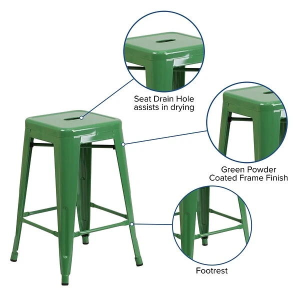 Upgrade the seating in your restaurant, eatery or home with this colorful counter stool with growing popularity. This space-saving stool is stackable making it great for storing. This stool features a backless, lightweight design that allows easy movement from inside areas to the patio or sidewalk to enjoy nice weather. A cross brace underneath the seat adds extra stability and features plastic caps that prevent the finish from scratching when stacked. The legs have protective floor glides that prevent damage to flooring. This all-weather use stool is great for indoor and outdoor settings. For longevity, care should be taken to protect from long periods of wet weather. The unique design of this backless stool gives it the versatility to be used in multiple spaces.