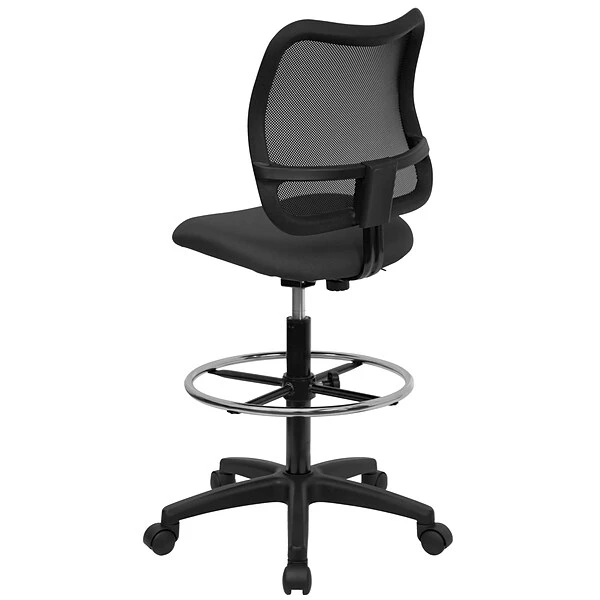 Flash Furniture Mid-back drafting stool with curved breathable mesh back has in built lumbar support and heavy duty nylon base. Stool featuring gray fabric seating has dual wheel casters and chrome foot ring with adjustable height.