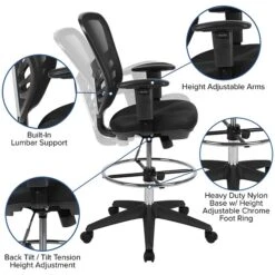 Discover a new way of office seating with an ergonomic drafting chair. With a rise in standing desks you need a compatible office chair to travel the distance with you. Enjoy the comforts of an ergonomic office chair in a taller frame to meet the needs of students and professionals working at above average desk heights. If you’re seeking an office chair to work at above standard heights in environments, such as banks, architectural firms, art studios and other creative spaces a mesh back drafting stool is your perfect match. This draft chair features a ventilated mesh back with lumbar support to keep you cool along with a convenient lever to adjust the seat height and lock the seat in place to prevent you from rocking. Turning the tilt tension adjustment knob increases or decreases the amount of force needed to rock or recline. From standing desks to drafting desks this ergonomic drafting chair with contoured padded swivel seat will provide you with the comfort that you need to suit your work environment. Let this tall task chair deliver comfort while you scratch items off your to-do list.