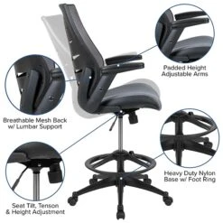 Make your daily tasks at work more pleasant with a high office chair designed especially for your high desk table needs. This tall task chair is ideal at sit-to-stand desks, standing desks, bar height tables and drafting tables. This mesh back drafting chair will make your receptionist’s desk look professional as visitor’s are being greeted. Enjoy the comforts of an ergonomic chair in a taller frame to meet the needs of students and professionals working at above average desk heights. No more miserable summer days at work when you have a mesh back office chair that’ll keep airflow circulating. The curved high back cradles you while offering built-in lumbar support.