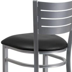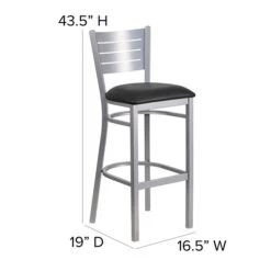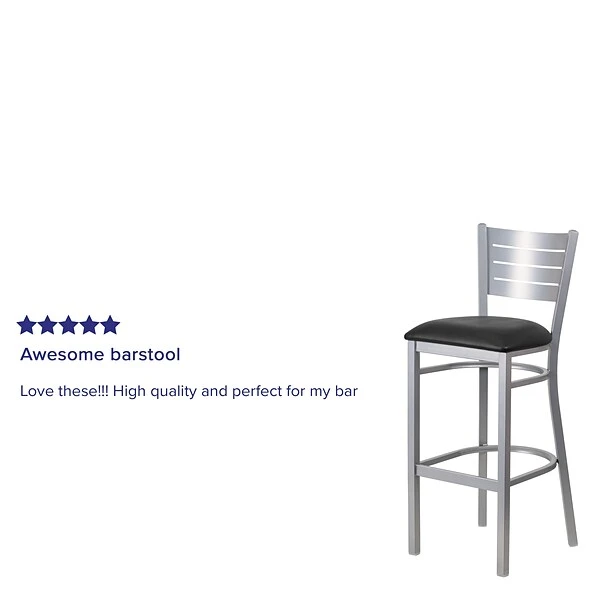 The silver slat back metal restaurant barstool will be an attractive addition to your eatery, pool hall or your bar at home. This metal barstool has a slat back design, black vinyl upholstered seat and an 18 gauge steel frame. The welded joint assembly and two curved support bars give the stool great strength and stability. The lower support bar doubles as footrest. Plastic floor glides protect your floors by sliding smoothly when you need to move the stool. The slat back metal restaurant barstool is a durable, commercial grade, restaurant barstool that also would be a great choice for use in your home.