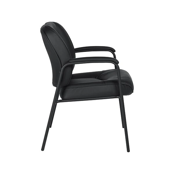 Ensure clients, customers, and patients people are comfortable in this black bonded-leather guest chair. The rigid steel frame is durable enough to handle the rigors of daily wear and tear and heavy use, while the black bonded leather provides a sophisticated look. Featuring padded armrests, this chair provides ample support to forearms and shoulders, while the included step-by-step instructions ensure assembly is fast and simple. This Global Luxhide bonded-leather guest chair boasts four sturdy legs to hold everything firmly in place, while the contoured cushion and thick padding make sitting for long periods of time more comfortable.