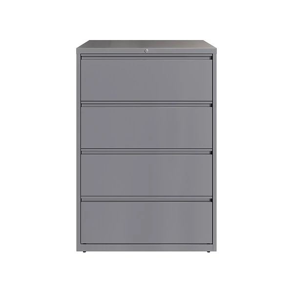 - Four-drawer lateral file cabinet holds letter-, legal-, or A4 size documents