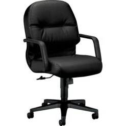 The HON pillow-soft executive chair in black is made of durable leather and is ideal for office desks. This chair measures 41.75 x 26.25 x 28.75 inches and has a back cushion that combines both foam and a layer of polyester fiberfill to support your spine.