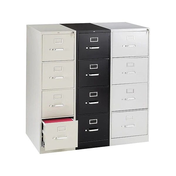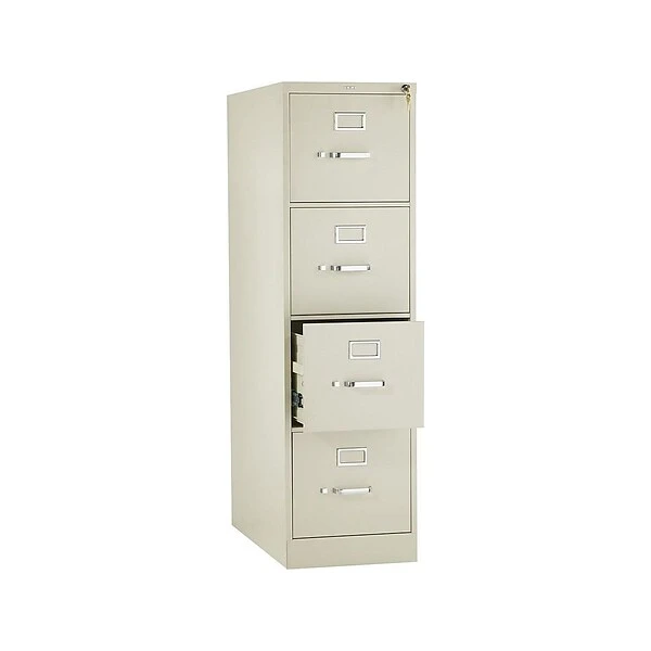- Four-drawer vertical filing cabinet holds letter-size documents