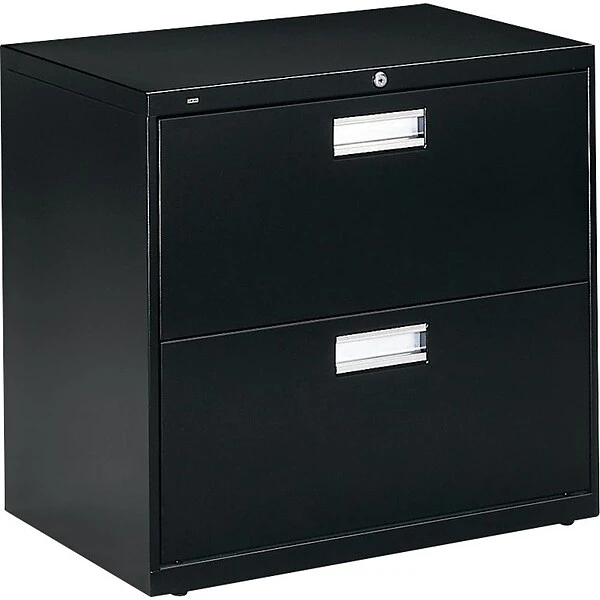 HON Brigade 600 Series Lateral file cabinet in black color is constructed from 30 percent post consumer materials. Lateral file cabinet measuring 28 1/2″ x 30″ x 19 1/4″ features two drawers for storing the files up to 2.41 cu. ft.