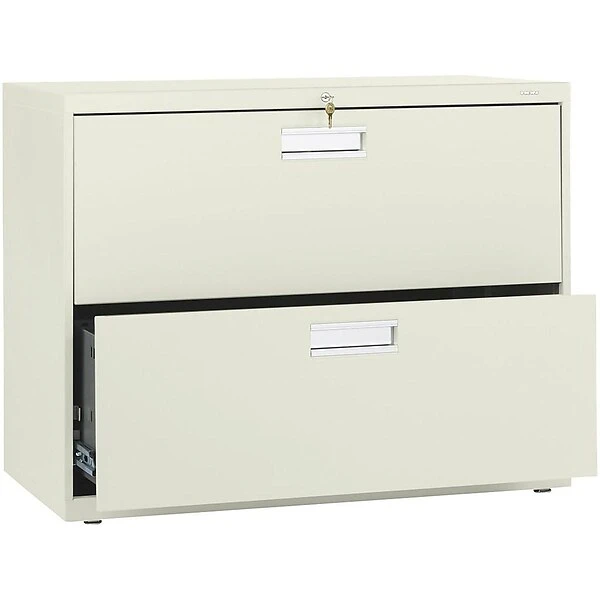 Keep your work space organized with this two-drawer lateral filing cabinet. It has a counterweight and mechanical interlock that keeps only one drawer open at a time for added stability, and leveling glides allow for proper placement on uneven floors. With a two-sided lock mechanism and removable lock core, this HON Brigade 600 series lateral file keeps sensitive documents securely tucked away.
