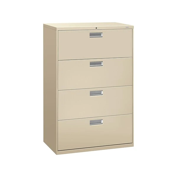 - Four-drawer lateral filing cabinet holds letter- or legal-size documents
