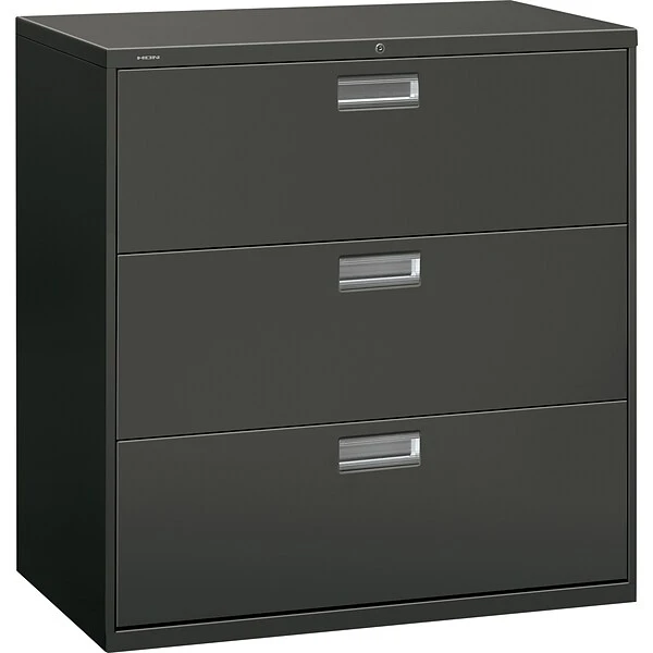 HONĀ® Brigade⢠600 Series Lateral file cabinet in charcoal color is constructed from 30 percent post consumer materials. Lateral file cabinet measuring 40 7/8″ x 42″ x 19 1/4″ features three drawers for storing the files up to 3.5 cu. ft.