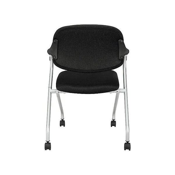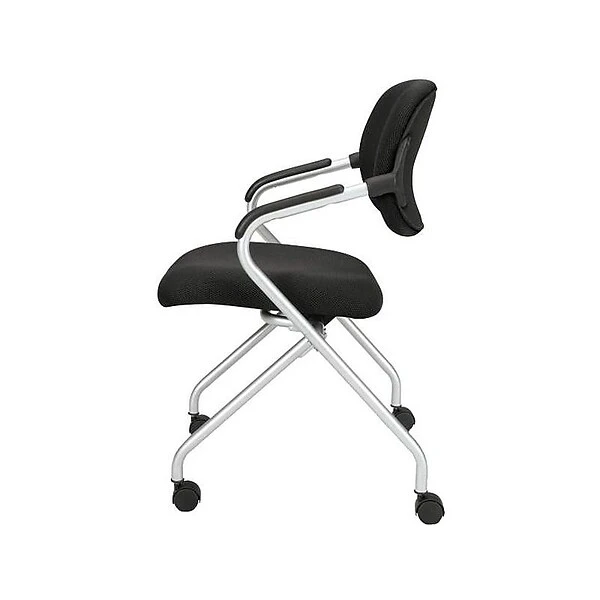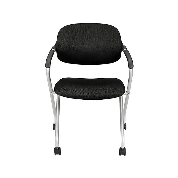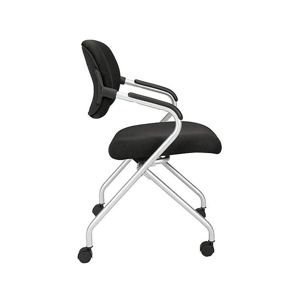 Enjoy the sturdy design of this black-fabric caster floating-back nesting chair. The four casters offer simple mobility across almost any hard surface, while the folding arms make it easy to store this chair in small spaces, saving valuable room for other purposes. With padded armrests to reduce the strain on your shoulders while supporting your forearms, working long hours at a computer or desk is a comfortable experience. The waterfall design of the seat cushion helps support circulation in your legs, while the open sides and lower back provide breathability. This HON nesting chair is easy to clean and has black fabric for a professional appearance.
