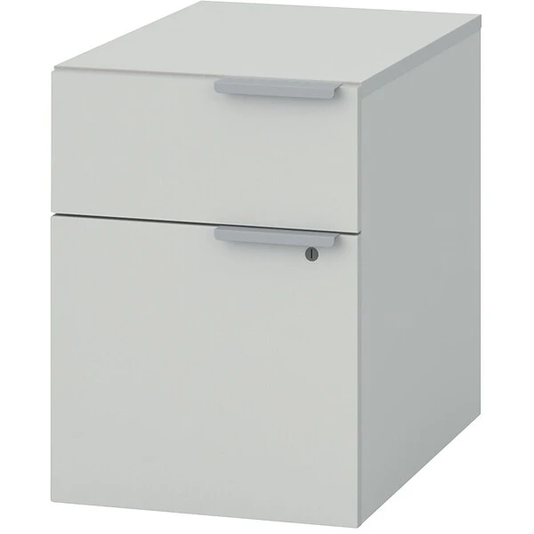 Easy-care laminate resists scratches, stains and spills. Smooth ball bearing suspension; file drawer extends fully and accepts letter- or legal-size hanging folders, box drawer extends 75%. HON® “One Key” interchangeable lock core. Four swivel casters plus an additional fifth wheel below the drawer front for stability.