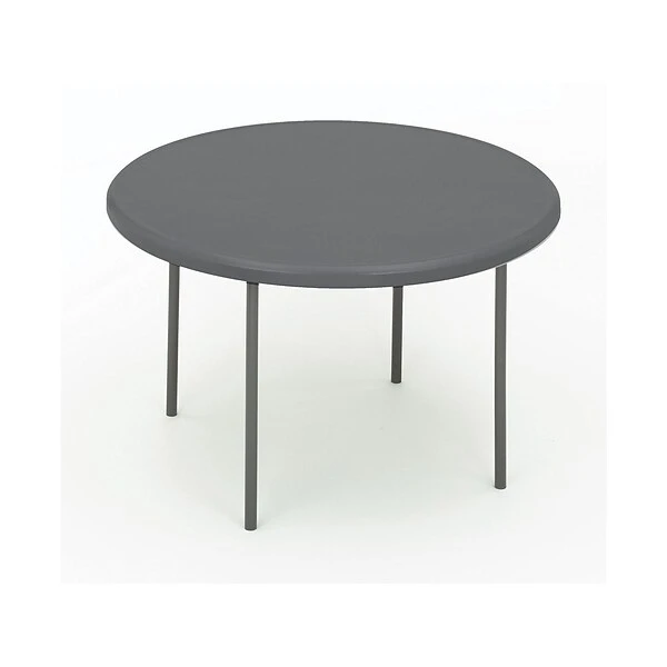 Gather clients, customers or staff around this folding table at meetings or special events. The round shape is perfect for use as a dining space, and the folding design allows for convenient storage. Powder-coated round tubing legs and integrated braces provide added strength and reinforcement. This Iceberg IndestrucTable TOO table boasts a neutral charcoal color, offering a professional appearance with or without a tablecloth.