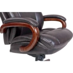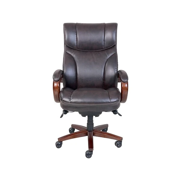 Make a style statement in your office with this executive office chair. Wellness By Design Flexible AIR Lumbar Technology creates instant lumbar support adjustments based on your movements, creating a uniquely personalized chair configuration that ensures you stay comfortable. With a large seating area and a 400-pound weight rating, this chair is ideal for users of all shapes and sizes. The layered body pillows offer enduring comfort, and the fixed padded arms provide extra support for your shoulders and upper body. Featuring bonded leather upholstery and walnut-finish accents, this La-Z-Boy Trafford big-and-tall executive office chair brings an upscale look to your workspace.