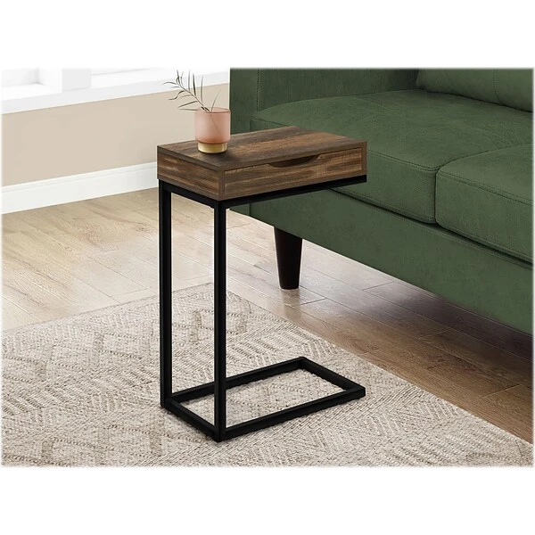 Tired of holding a beverage in your hand and a bowl of popcorn in your lap while binge-watching? This Monarch Specialties Inc. C-table keeps them within easy reach so you can sit back and enjoy the show. The C-shaped base slides under your sofa or chair, placing the table surface close to you. For added convenience, the top includes a storage drawer that is accessible from both sides. Use it to hide away mobile devices to avoid interruptions while you’re watching TV, then store remotes in it when you’re done. Stylish and versatile, this portable accent table features a top in a brown reclaimed wood-look finish and a metal frame in black that adds a modern look wherever you need a small side table with storage.