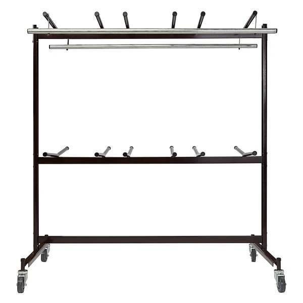 The 84-60 Series “Checkerette,” a Double-Tiered Hanging Chair Dolly & Coat Rack, is a wise and versatile choice for saving time and space in busy multipurpose environments. Quickly set up, take down and store as many as 84 steel or plastic folding chairs with this durable, tubular steel, easy-to-assemble unit that comes with a brown powder-coated paint finish. The Checkerette includes two removable steel rods to effortlessly convert the chair dolly into a handy coat check that can store up to 60 coats! Four heavy-duty thermoplastic rubber 4″ swivel casters allow you to move the dolly with ease, even through doorways. Each caster boasts a 330 lb. weight capacity for a total of 1320 lbs.