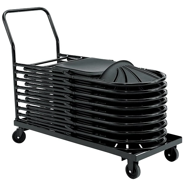 The DY1100 Dolly can stack and transport up to 26 NPS 1100 Series folding chairs. This durable 11-gauge black powder-coated steel unit features four 4 nylon casters (two that swivel) for easy mobility over nearly any surface. Each caster boasts a 275 lb. weight capacity for a total of 1100 lbs.