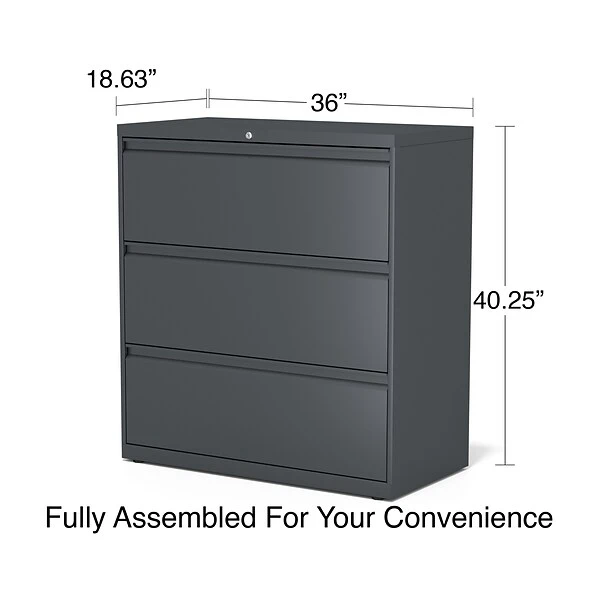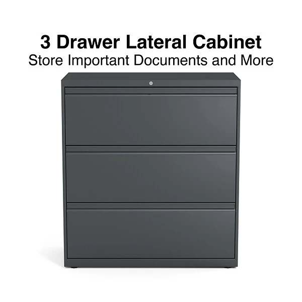 This Quill Brand 36-inch-wide lateral file cabinet has a charcoal finish and three drawers for tidy organization of your letter-, legal-, and A4-size documents.