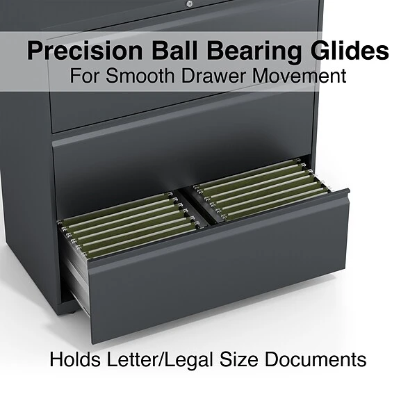 The lateral design of these file cabinets allows your employees to create a large, organized filing system within each of the separate drawers. Leveling glides and ball bearing slide suspension ensure easy opening and closing of drawers.