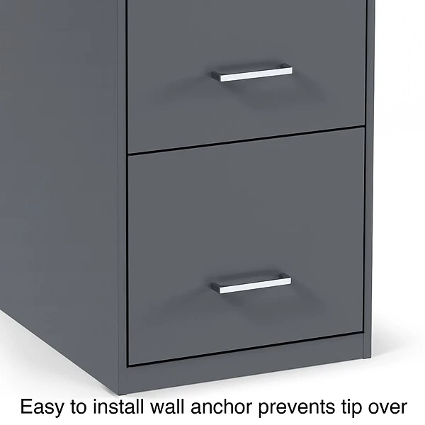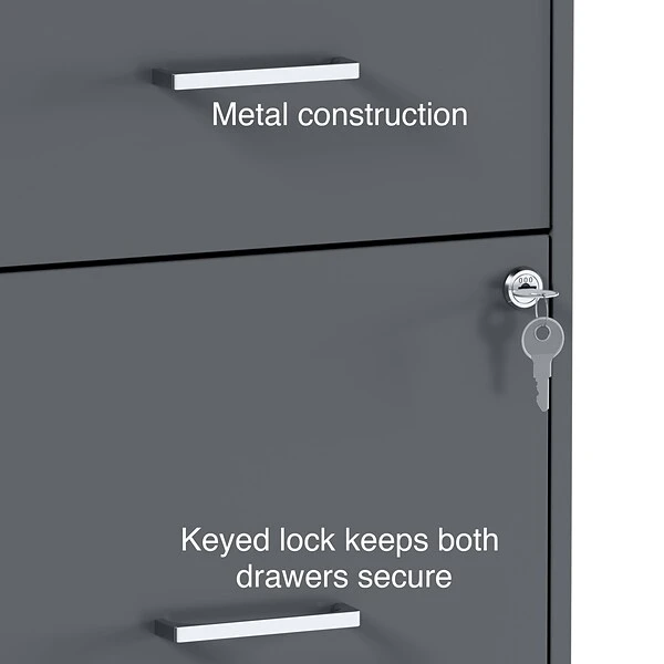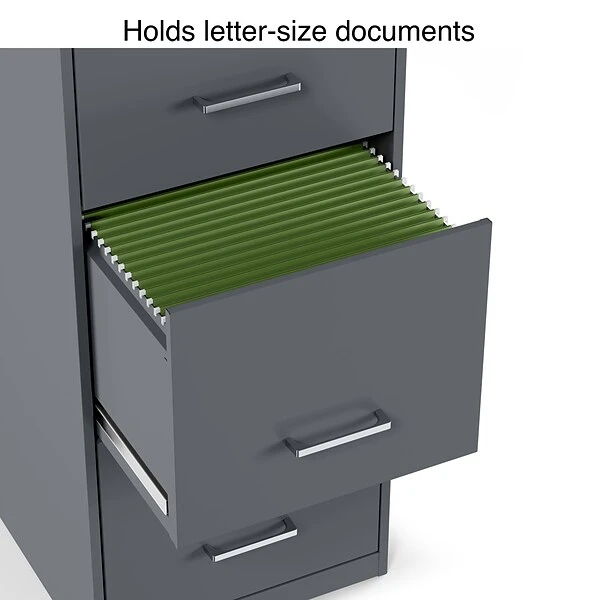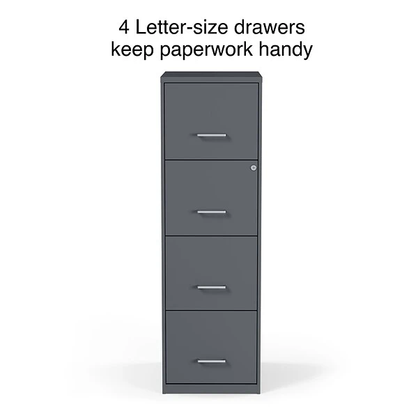 Organize your home or professional workspace with the Staples 4-Drawer vertical file cabinet. Keep all your letter-sized documents secure and tucked away in four 18ā depth drawers. This file cabinet comes equipped with one factory installed lock and key, controlling the top two drawers for peace of mind and security. The sleek charcoal finish and polished handles keep your office space looking contemporary and organized . This cabinet is Backed by a 7-year limited warranty, keeping you satisfied for years to come.